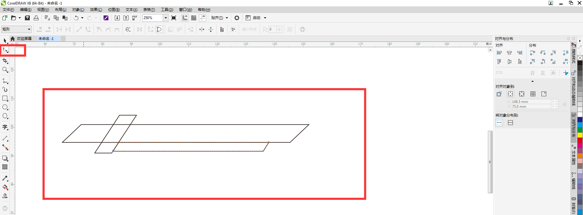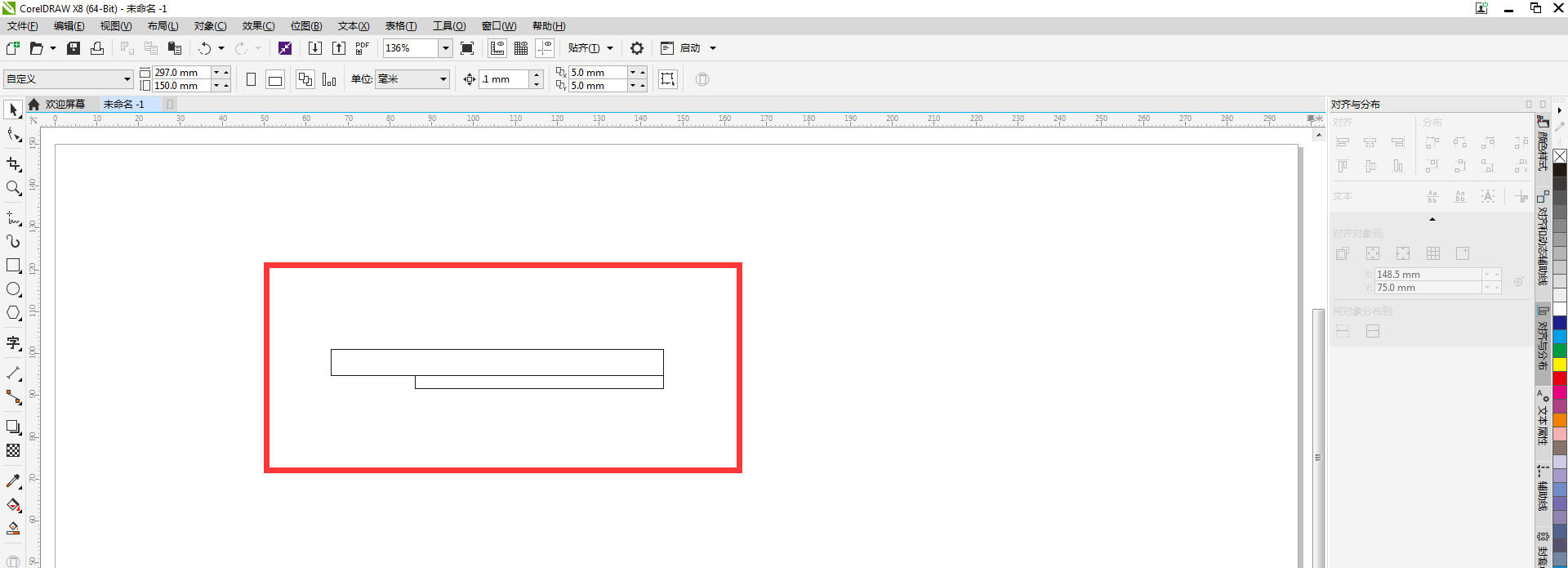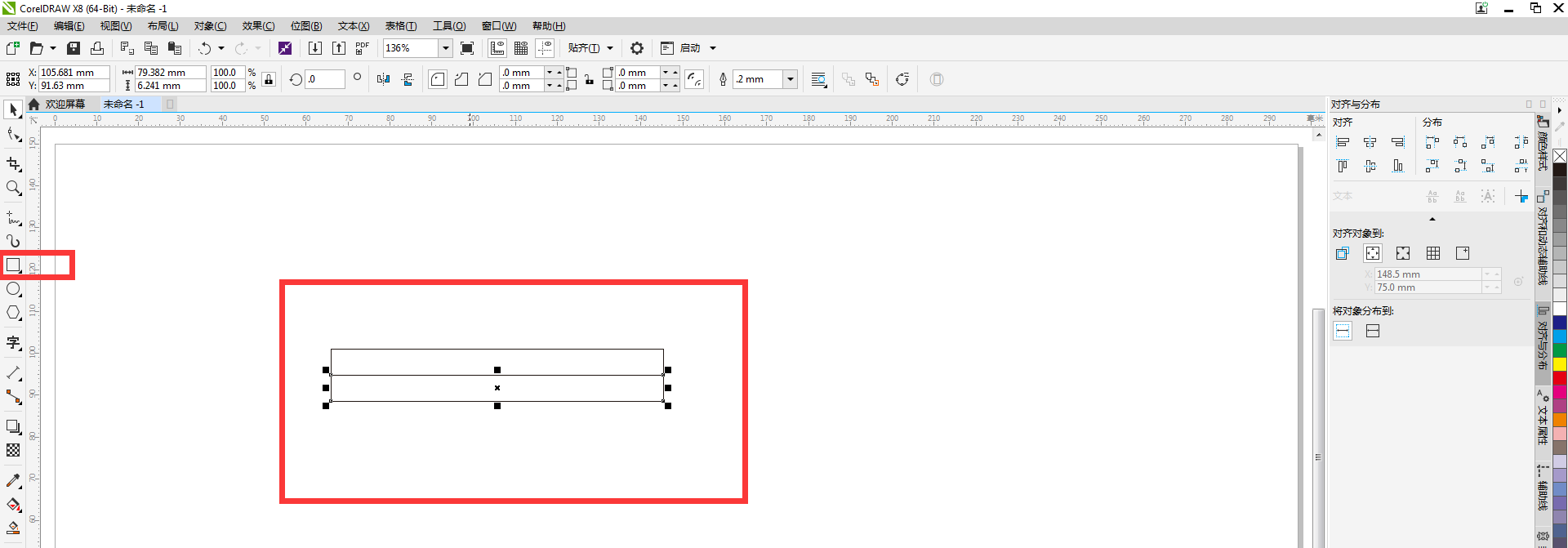 打开cdr软件,新建文档,点击矩形工具绘制一个矩形,按住ctrl键翻转复制,再改变复制矩形的尺寸。