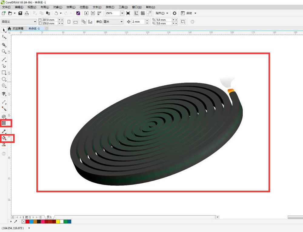 旋转立体角度,更改立体图形的渐变颜色,点击贝塞尔工具绘制蚊香燃烧的图形。