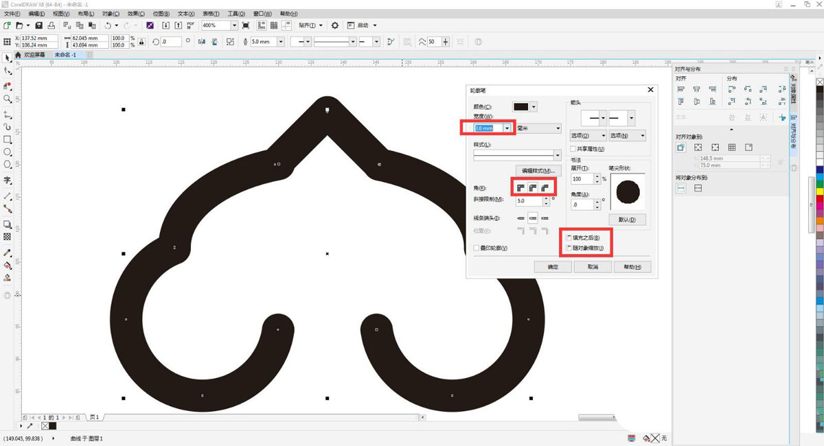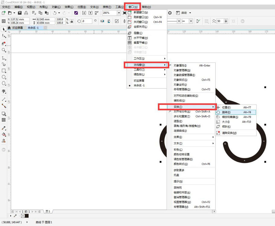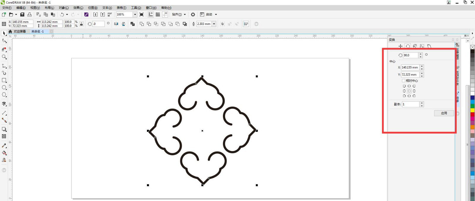 选中曲线,按f12调整描边粗细,把端角改为圆角,再选中图形,把旋转中心点拖到底部,打开窗口--泊坞窗--变换,角度改为90度,点击应用。