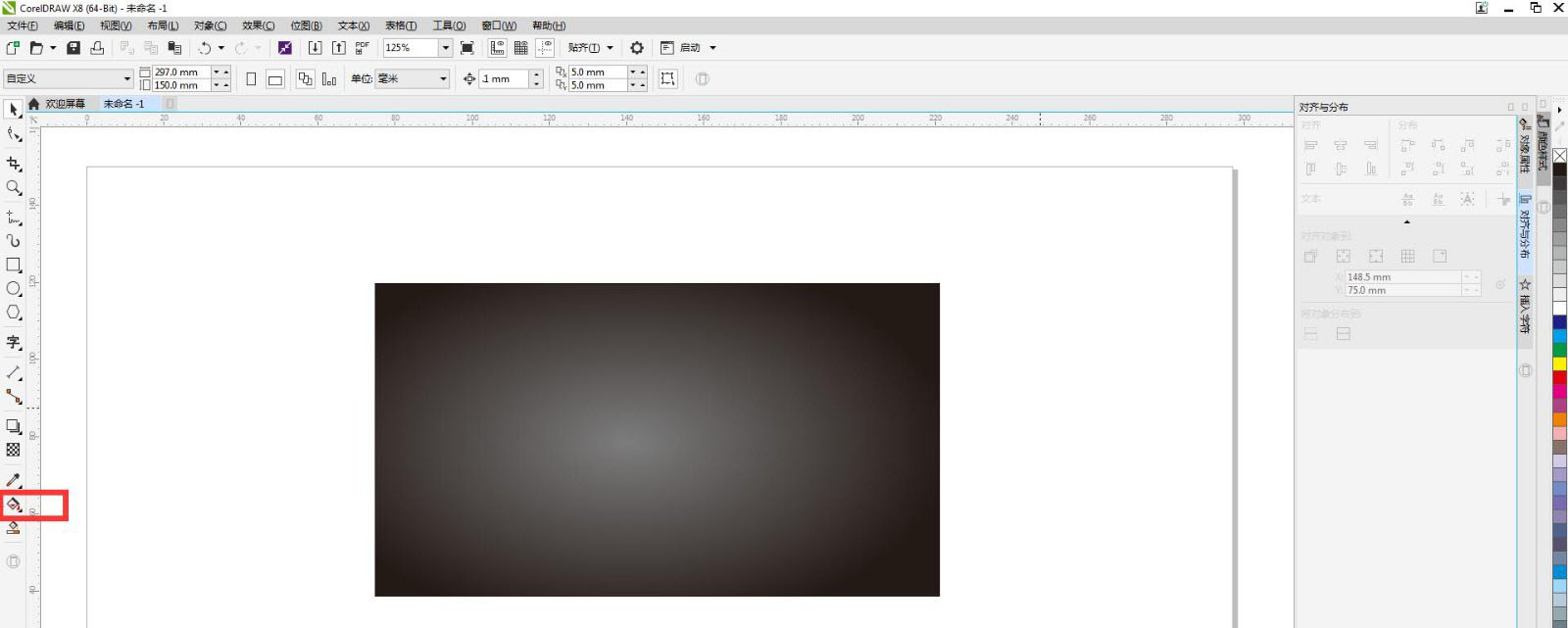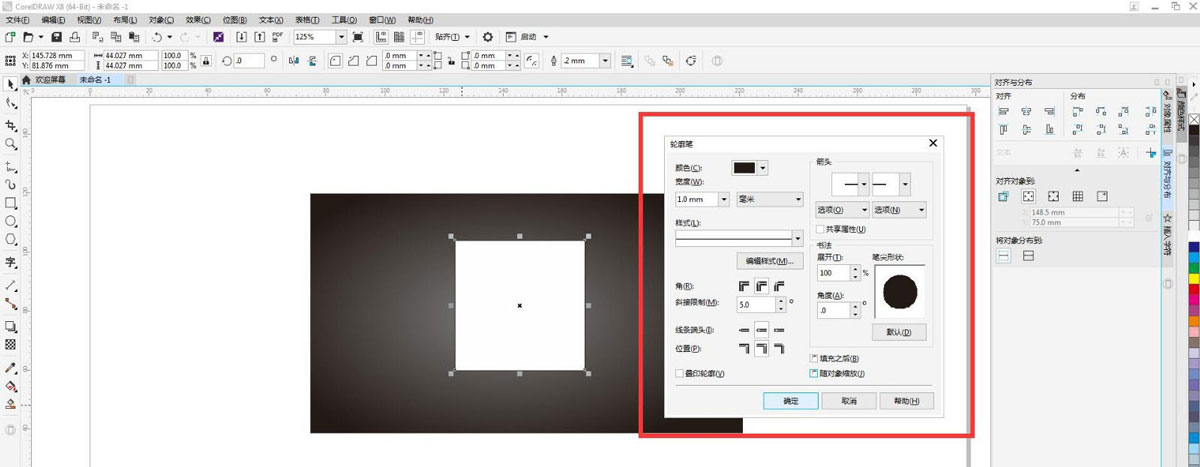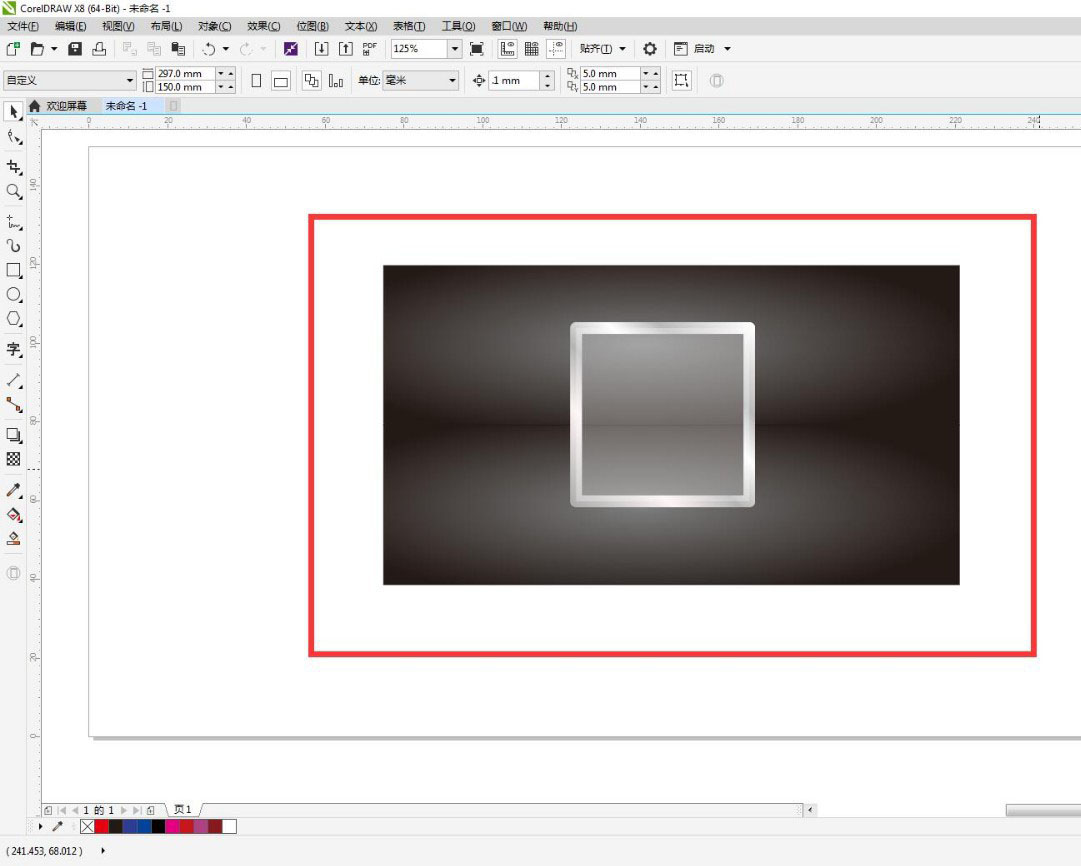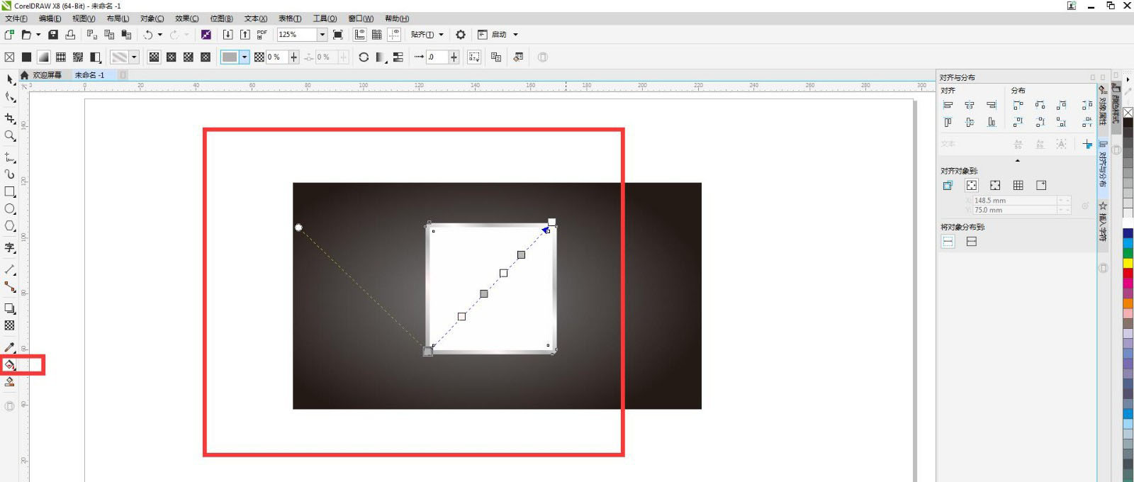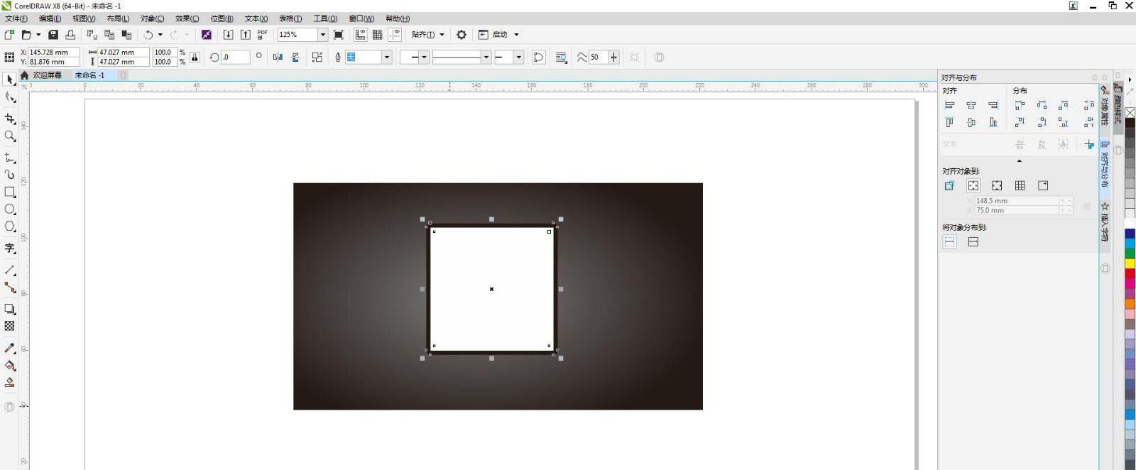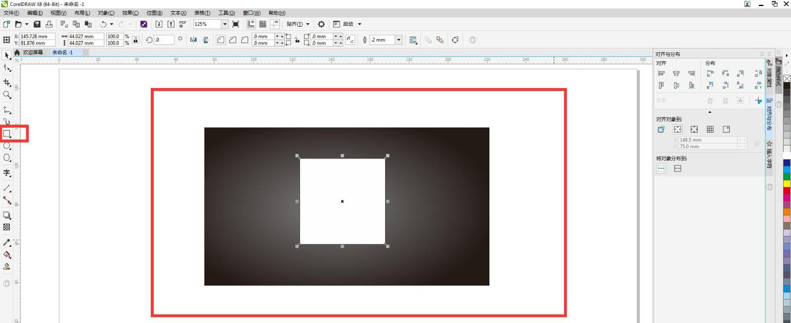 点击交互式填充工具给矩形填充一个渐变颜色,再点击矩形工具按住ctrl键绘制一个正方形,填充白色,按f12键将轮廓加粗,再按ctrl+shift+q键将轮廓转化为对象。