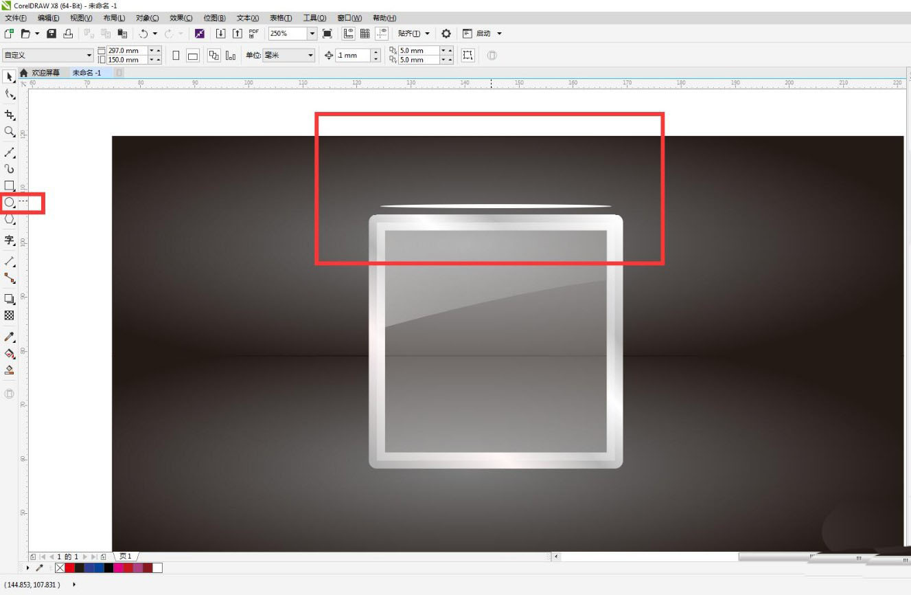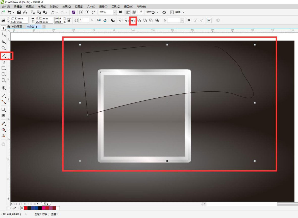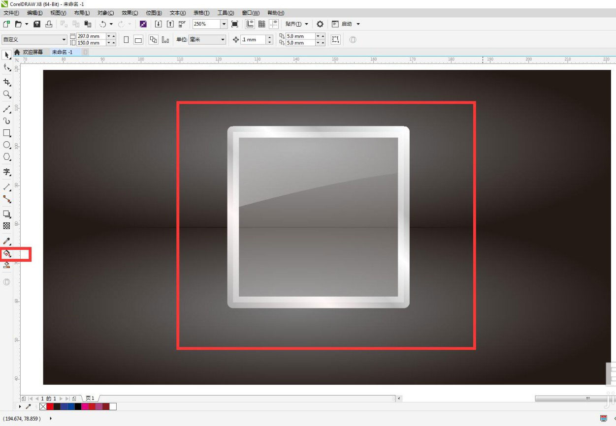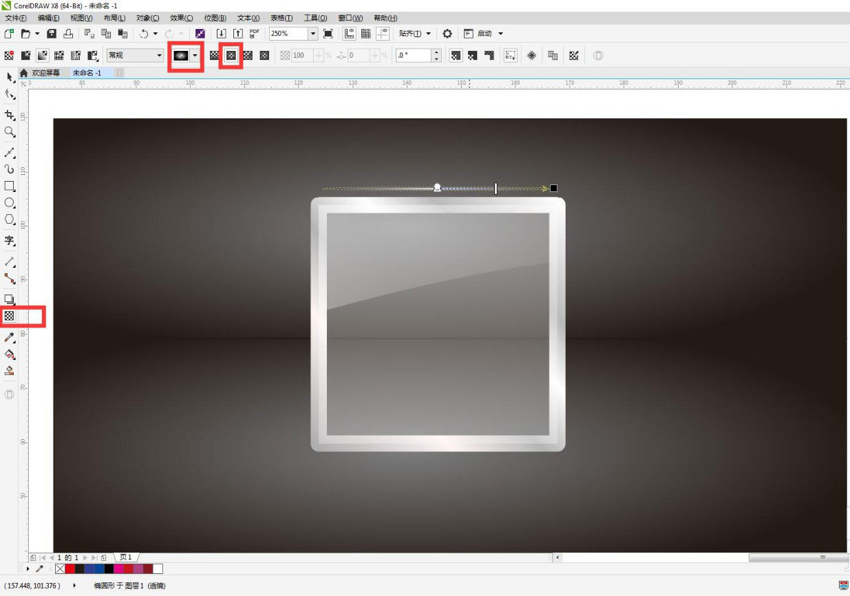 选中轮廓点击交互式填充,填充一个渐变颜色,降低白色矩形的不透明度,点击贝塞尔工具画出玻璃反光的部分和玻璃相交,再用交互式填充工具添加渐变,删除不要的部分。