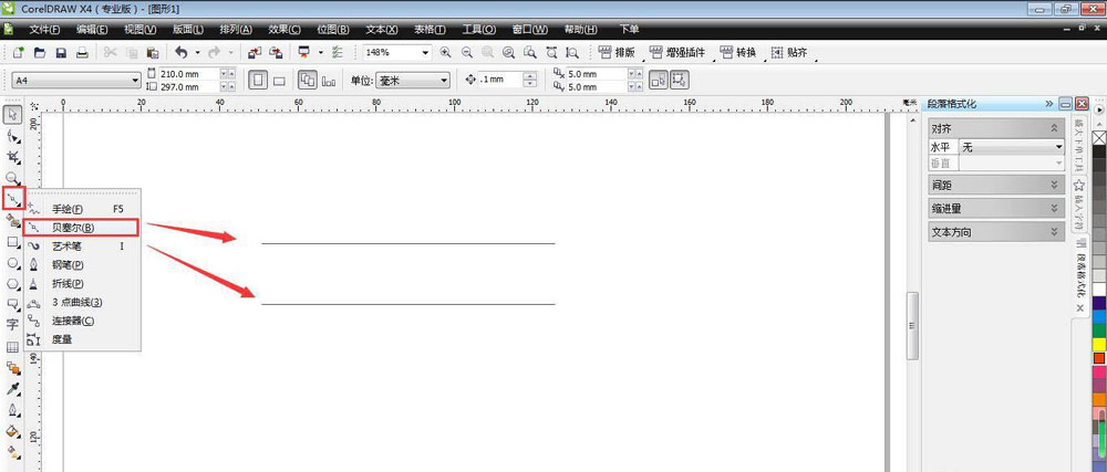 用“贝塞尔”工具画出一直线,按着“Ctrl”点击直线向下拖动右击并复制一条直线。