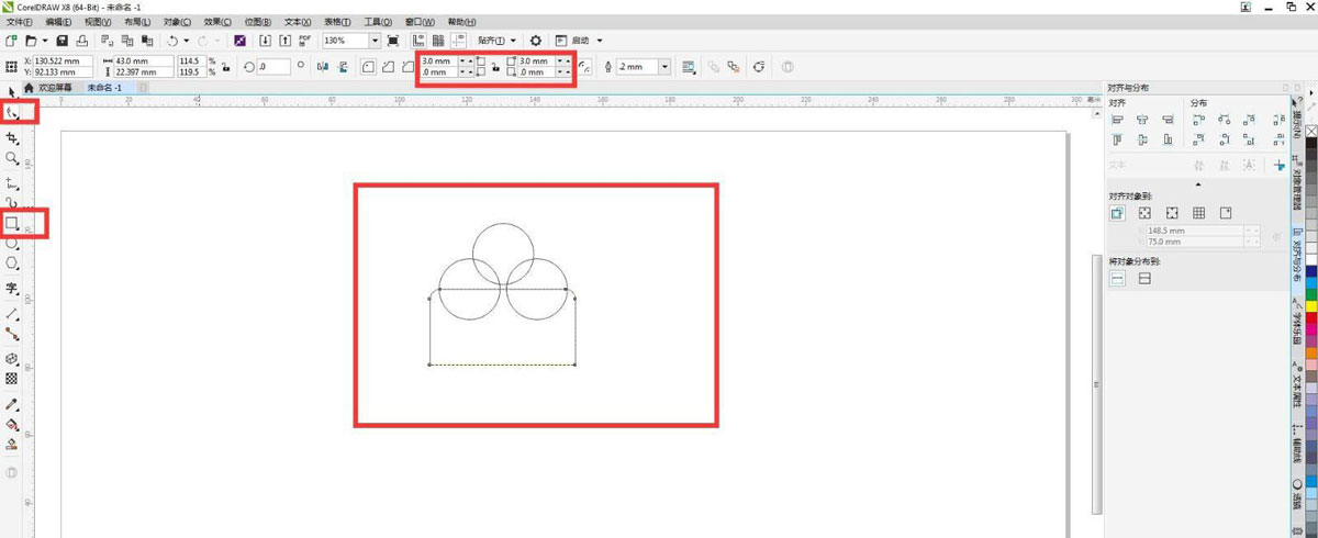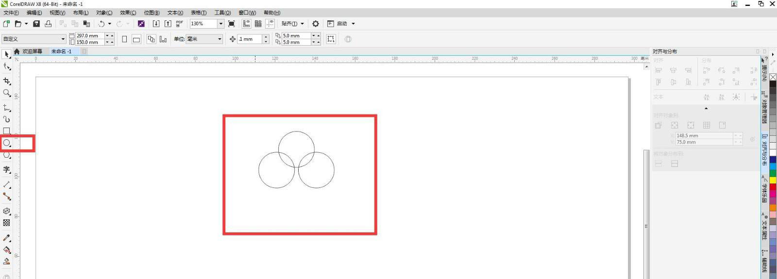 打开cdr软件,点击新建文档,点击椭圆工具,按住ctrl键绘制一个正圆,再按住shift键复制两个正圆并对齐。