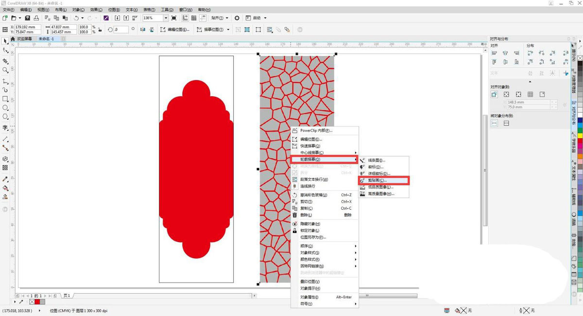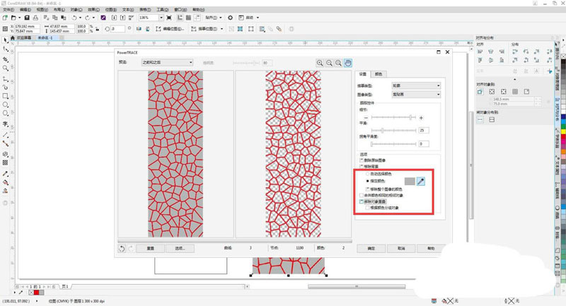 点击位图,鼠标右键点击轮廓描摹--剪贴画,点击指定颜色,用吸管吸取背景颜色,勾选移除整个图像的颜色,移除对象重叠, 再把它移到长方形里面,给长方形添加轮廓边,这样随机镂空文化墙就做好了。