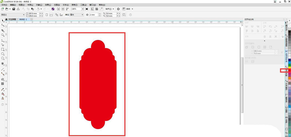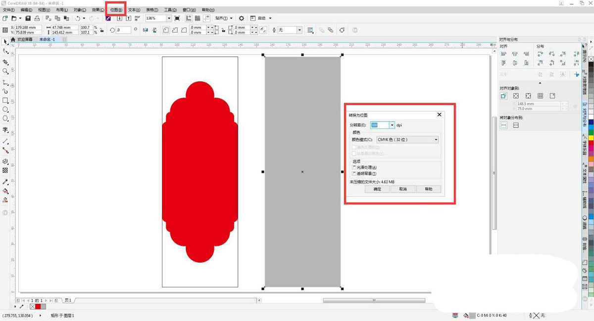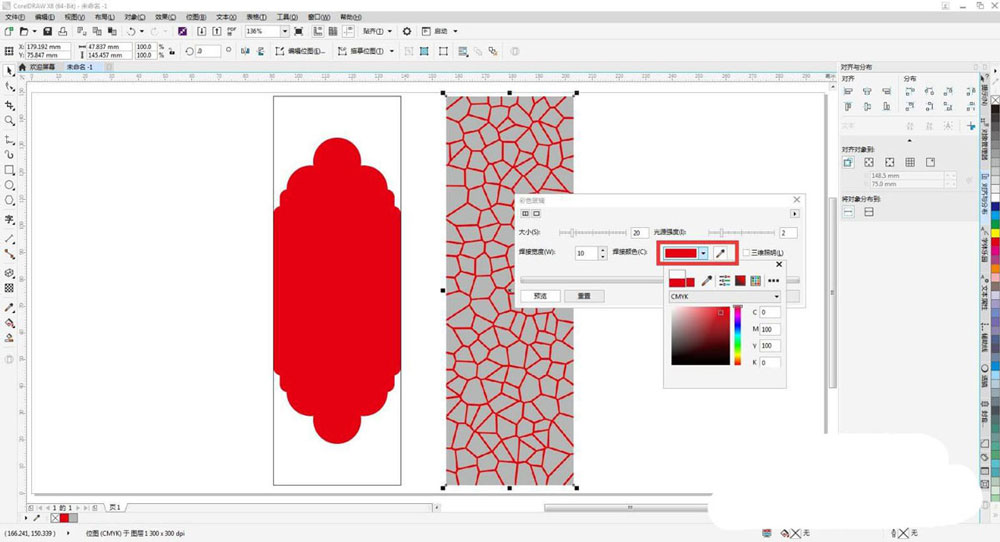 点击矩形工具沿图形绘制一个大的矩形,再拖动复制一个填充颜色,将复制的颜色转为位图,再点击位图--创造性--彩色玻璃,点击吸取颜色。