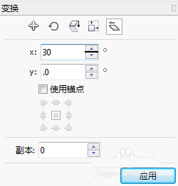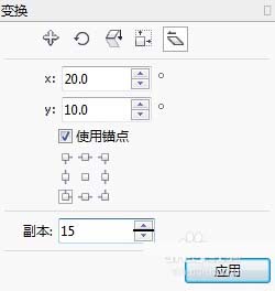 2、输入适当的X和Y值,如X值:20、Y值:10。勾选“使用锚点”,选择某一锚点,如“左下”。输入需要的副本数量,如15。