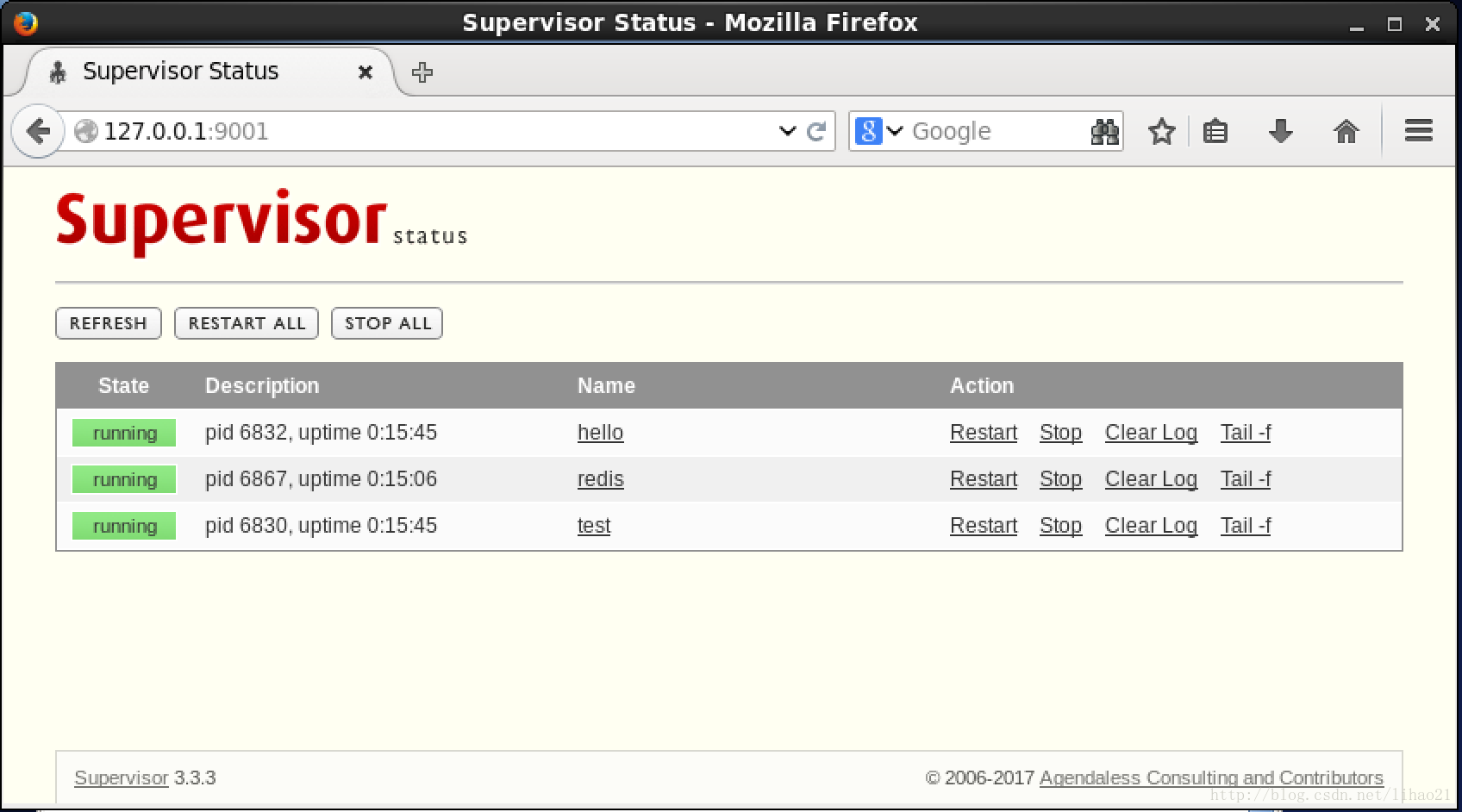 在此界面下,可以对单个进程进行重启,关闭,查看日志等操作,也可以对所有的进程进行重启,关闭等操作。
