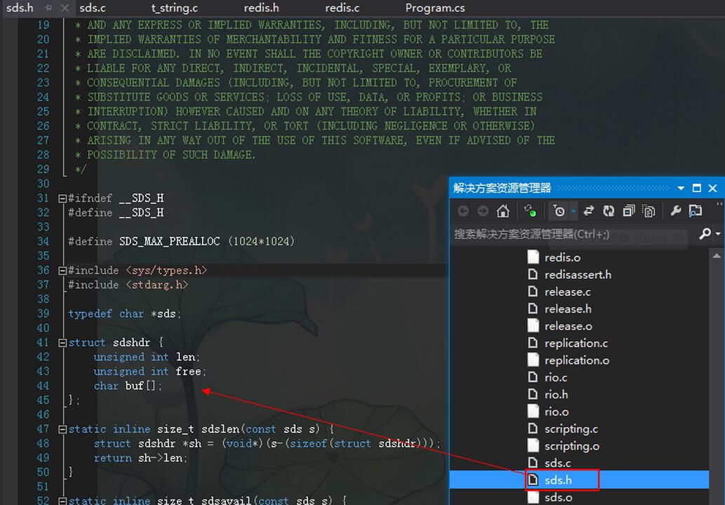 在redis里面是采用SDS(simple dynamic string)来封装char[]的,这个也是redis存储的最小单元,下一个问题就是哪里能看得到呢?我在wget压缩包的时候,里面就有redis源码啦,据说还只有3w多行,这就告诉我们,有什么问题,自己动手丰衣足食,对吧,为查找方便,我就把redis的源码拖到window上用vs打开,接下来我们看看SDS长成啥样???
