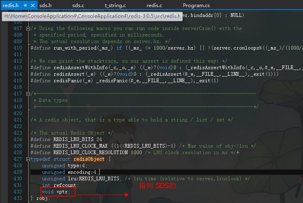 可以看到RedisObject是在redis.h源代码文件中的,下面我简单说说type和ptr属性,详细的东西在后续说。