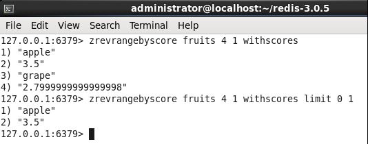 127.0.0.1:6379> zrevrangebyscore fruits 4 1 withscores 1) "apple" 2) "3.5" 3) "grape" 4) "2.7999999999999998" 127.0.0.1:6379> zrevrangebyscore fruits 4 1 withscores limit 0 1 1) "apple" 2) "3.5" 127.0.0.1:6379>