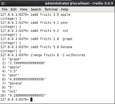 127.0.0.1:6379> zrem fruits apple (integer) 1 127.0.0.1:6379> zrange fruits 0 -1 withscores 1) "grape" 2) "2.7999999999999998" 3) "pear" 4) "4.0999999999999996" 5) "banana" 6) "5" 7) "nut" 8) "9.1999999999999993" 127.0.0.1:6379>