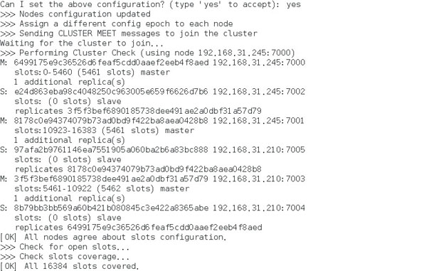 redis-trib.rb create --replicas 1 192.168.31.245:7000 192.168.31.245:7001 192.168.31.245:7002 192.168.31.210:7003 192.168.31.210:7004 192.168.31.210:7005