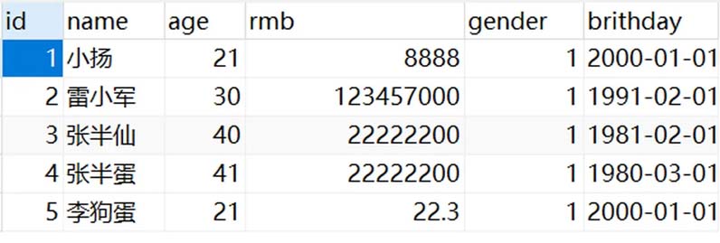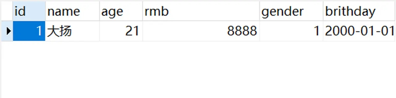 result, e := db.Exec("insert into person(name,age,rmb,gender,brithday) values(?,?,?,?,?);", "小扬", 21, 8888, true, 20000101)