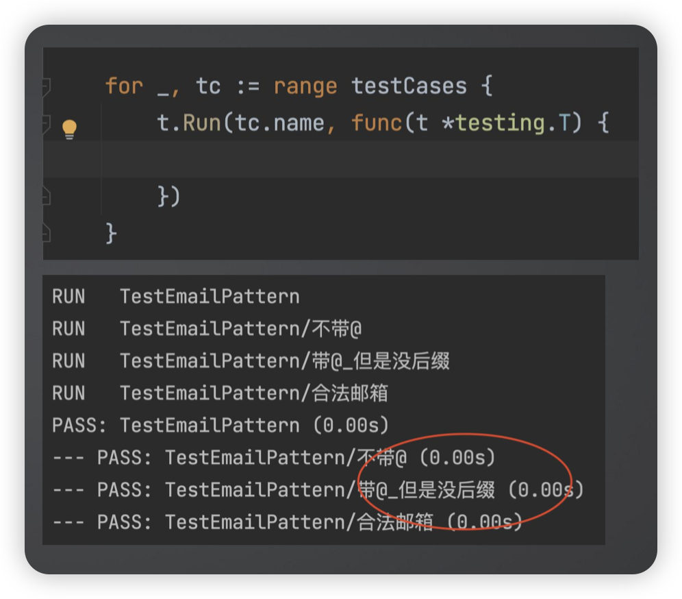 测试里面的testCases是一个匿名结构体的切片,所以运行的时候就是直接遍历。