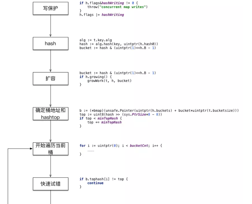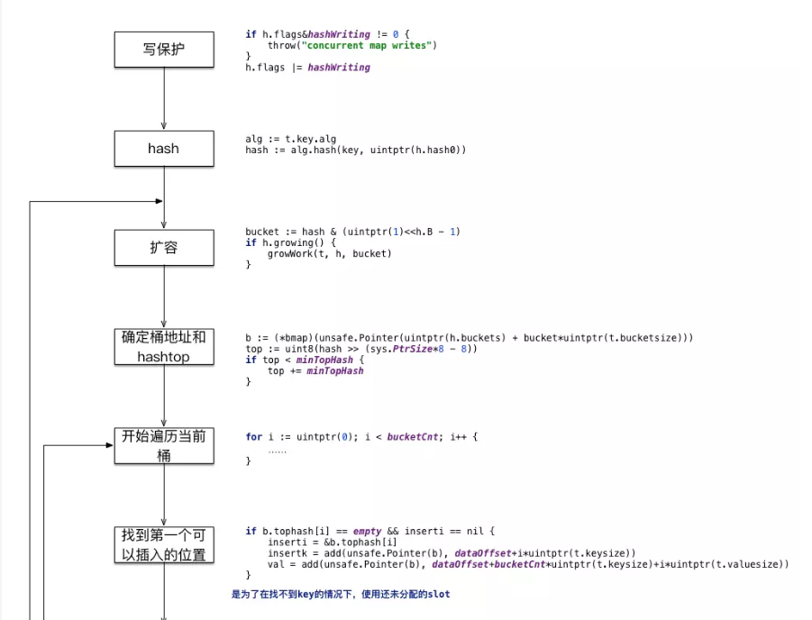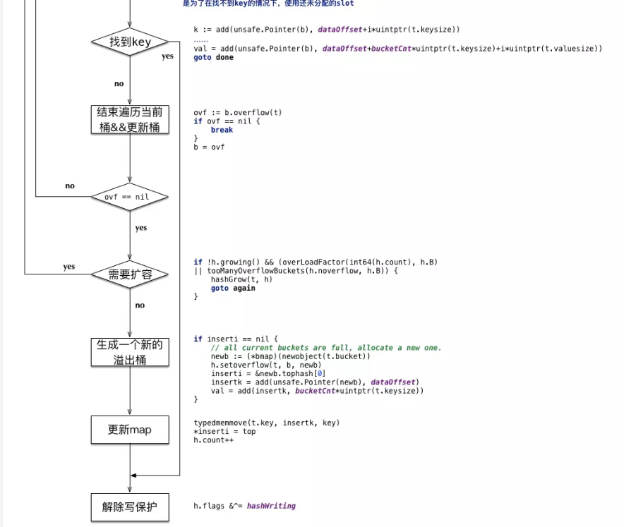 为一个key分配空间的逻辑,大致与查找类似;但增加了写保护和扩容的操作;注意,分配过程和删除过程都没有在oldbuckets中查找,这是因为首先要进行扩容判断和操作;如下: