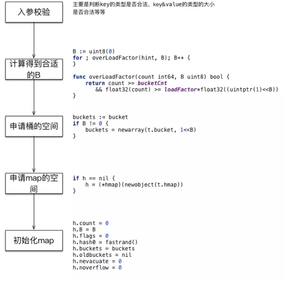 map的创建比较简单,在参数校验之后,需要找到合适的B来申请桶的内存空间,接着便是穿件hmap这个结构,以及对它的初始化。