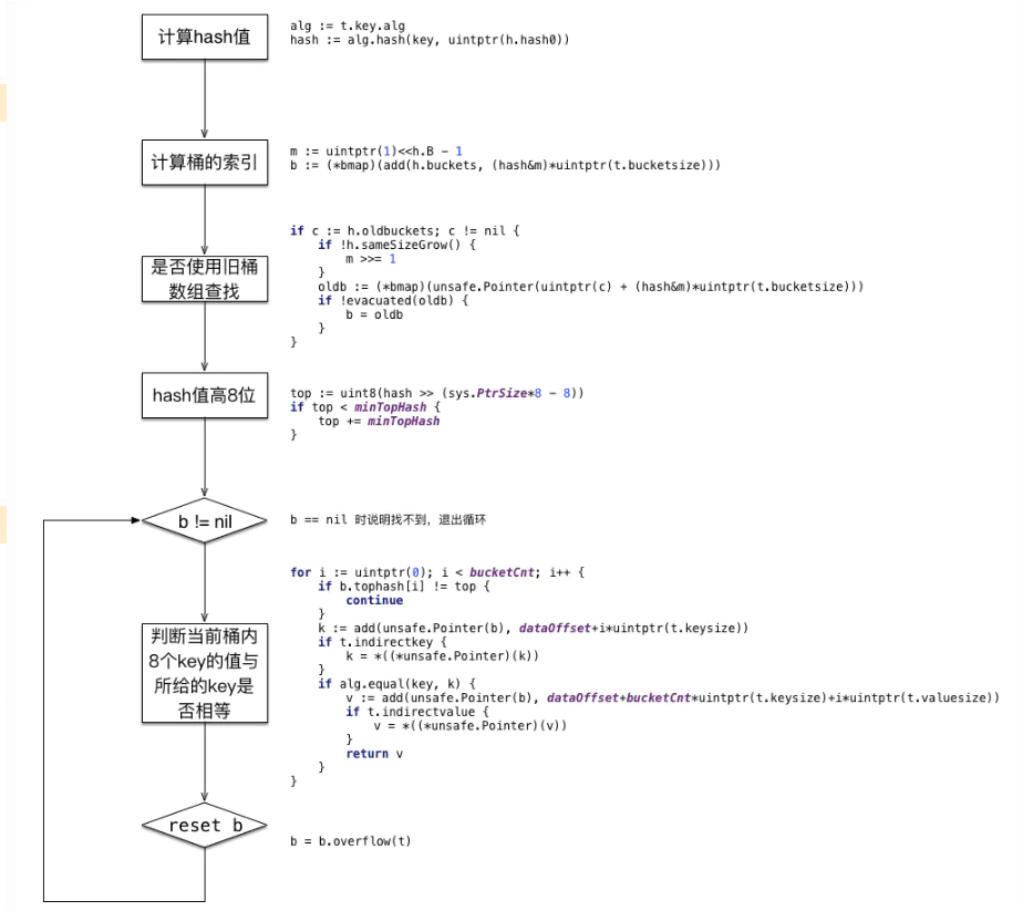 | key | hash := alg.hash(key, uintptr(h.hash0)) | top := uint8(hash >> (sys.PtrSize*8 - 8)) | bucket := hash & (uintptr(1)<<h.B - 1),即 hash % 2^B |