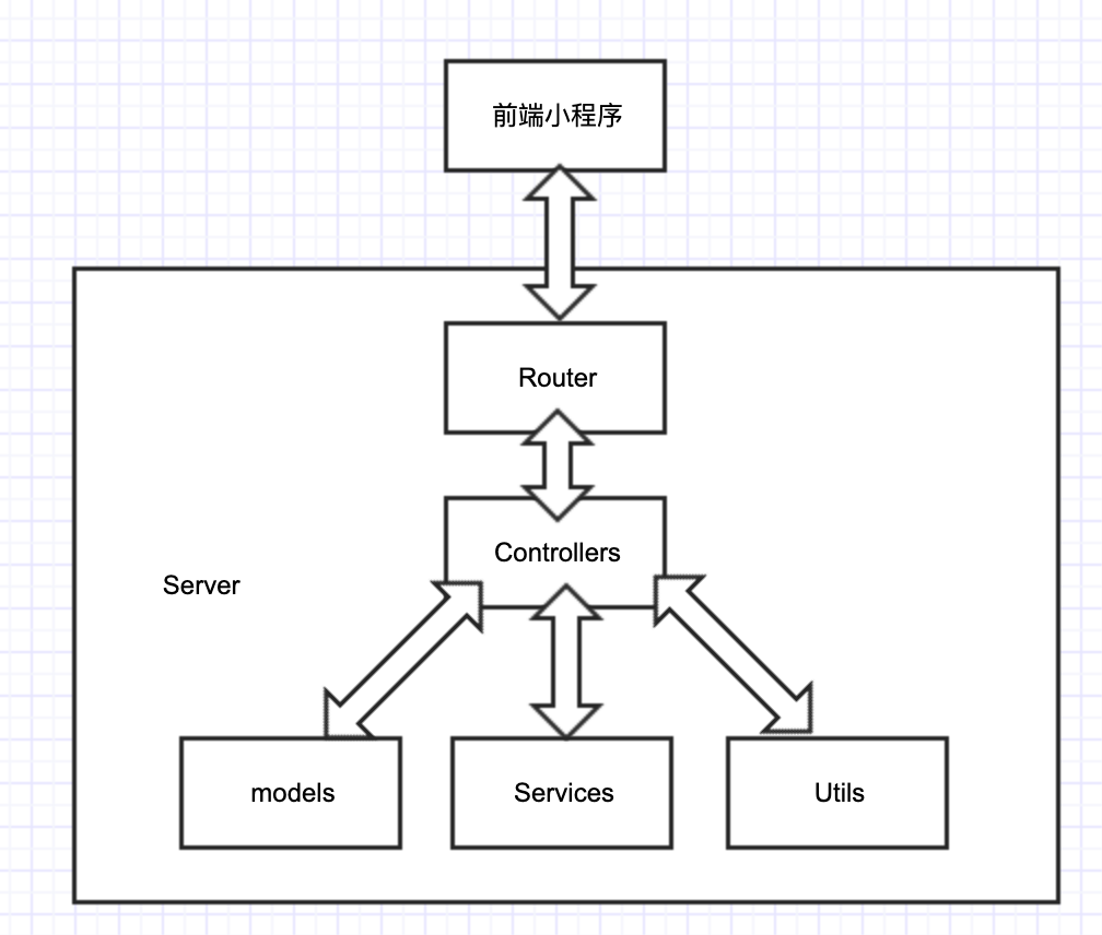 前端小程序发起HTTP请求到Router(router转发请求的各个阶段能做一些过滤,这个后面要说一下),router识别出请求链接,将其转发到相应的controller上面。还有三个底层的package: