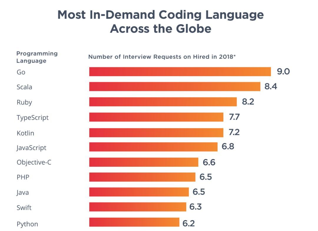 GO语言在WEB开发领域中的使用越来越广泛,Hired 发布的《2019 软件工程师状态》报告中指出,具有 Go 经验的候选人是迄今为止最具吸引力的。平均每位求职者会收到9 份面试邀请。