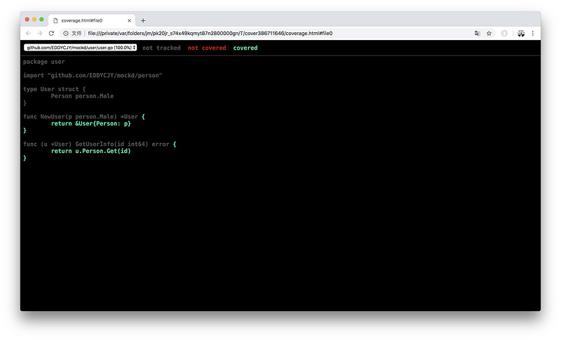 $ go test -cover ./user ok github.com/EDDYCJY/mockd/user (cached) coverage: 100.0% of statements