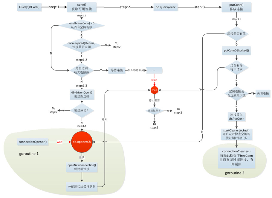 另外Query、Exec有个重试机制,首先优先使用空闲连接,如果2次取到的连接都无效则尝试新创建连接。