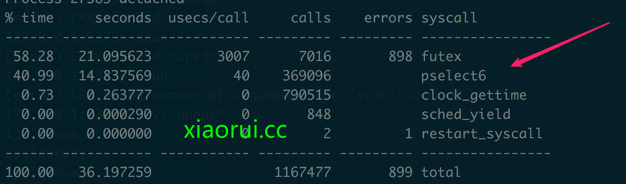 下面的截图是用strace统计出来的系统调用…. 我们发现 futex 和 pselect6 的syscall非常的多…. futex 是锁的调用,pselect6可以理解为select的加强版,除了我们不关心的信号掩码外,他是支持纳秒级别的定时器。