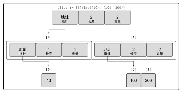 其中第一维可以看成长度为 2,容量为 2 的保存了切片类型的切片,第二维则是整形切片。