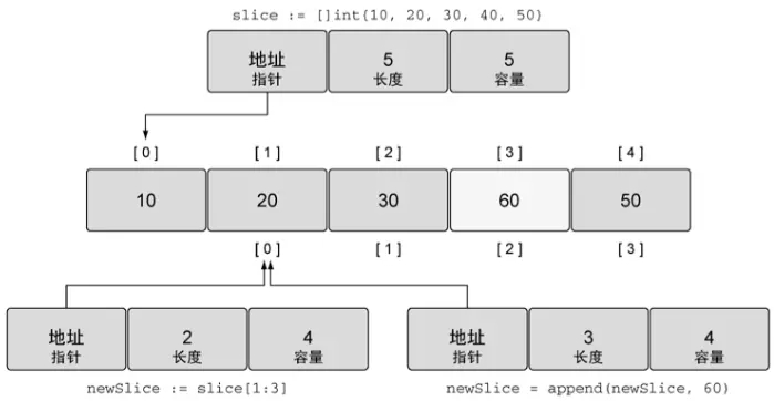 // 将新元素赋值为 60,会改变底层数组中的元素