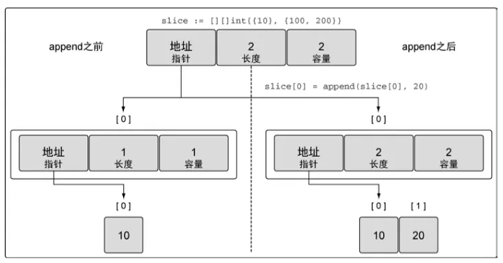 // 为第一个切片追加值为 20 的元素 slice[0] = append(slice[0], 20)