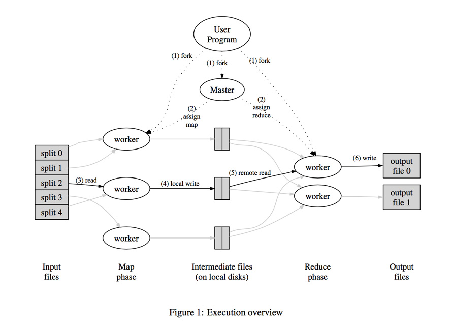 上图是论文中mapreduce的大体架构。总的来说Mapreduce的思想就是分治思想:对数据进行分片,然后用mapper进行处理,以key-value形式输出中间文件;然后用reducer进行对mapper输出的中间文件进行合并:将key一致的合到一块,并输出结果文件;如果有需要,采用Combiner进行最后的合并。