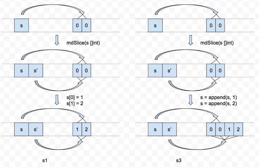 这里我们需要把 slice 想象为特殊的指针,其已经保存了所指向内存区域长度,所以 append 之后的内存并不会反映到 main() 中: