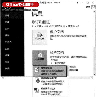 (1 )启动Word 2013并打开文档,单击“文件”标签,在打开的窗口左侧选择“信息”选项,在右侧单击“检查问题”按钮,在打开的下拉列表中选择“检查文档”选项,如图1所示。