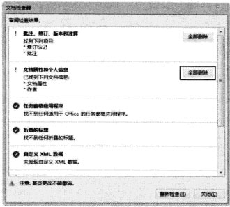 (3) Word对“文档检查器”中勾选的项目检查完成后将显示检查结果。单击“文档属性和个人信息”栏中的“全部删除”按钮,如图4所示,文档属性和个人信息将被删除,“文档检查器”对话框中将显示删除结果,如图5所示。