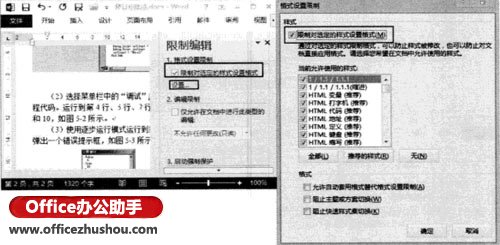 (2)打开“限制编辑”窗格,勾选“限制对选定的样式设置格式”复选框,单击“设置”链接打开“格式设置限制”对话框,勾选“限制对选定的样式设置格式”复选框,在“当前允许使用的样式”列表框中勾选相应的选项选择允许使用的样式,在“格式”栏中勾选相应的选项设置对格式操作的限制,完成设置后单击“确定”按钮关闭对话框,如图2所示。