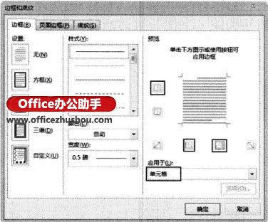 2、打开“边框和底纹”对话框,在预览栏中单击相应的按钮可以添加或取消边框线,如当按钮□处于按下状态时,表示单元格在该位置有边框线,单击该按钮取消其按下状态,则可以取消对应的边框线。这里通过单击相应的按钮取消单元格的上方、左侧和右侧的边框线,最后在“应用于”下拉列表中选择“单元格”选项,如图2所示。