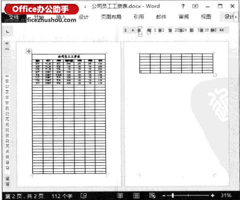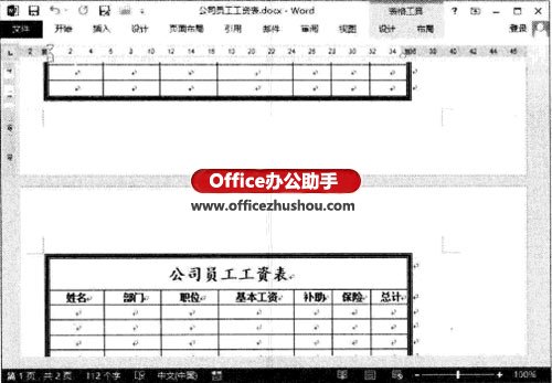 (1)启动Word 2013,打开需要处理的表格。在这个文档中有一个跨页的工资表,第二页的表格没有出现第一页的表头,如图1所示。