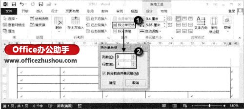 (2)将插入点光标放置到需要拆分的单元格中,再在“表格工具一布局”选项卡的“合并”组中单击“拆分单元格”按钮,打开“拆分单元格”对话框,设置单元格拆分成的行列数后单击“确定”按钮关闭对话框,如图3所示。此时选定的单元格被拆分,如图4所示。