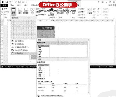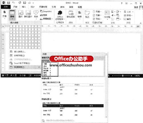 (1)在“插人”选项卡中单击“表格”按钮,在打开的列表中选择“快速表格”选项。在打开的级联列表中选择需要使用的表格即可将其插人文档,如图1所示。