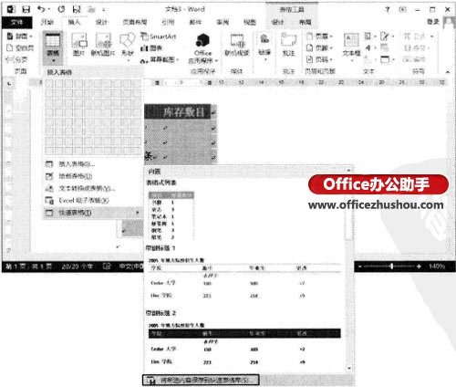 为了方便用户快速创建某种特定样式的表格,Word 2013提供了一个“快速表格”库,库中内置了一些带有样式的表格供用户直接选择并应用到文档中。同时,用户也可以将经常使用的表格添加到这个库中,从而使已经完成样式设定的表格能够重复使用,而不必每次重新建立。这对于那些经常要创建大量具有相同样式表格的用户来说,可以极大地提高工作效率。下面介绍使用快速表格库中的表格和向库中添加表格的方法。